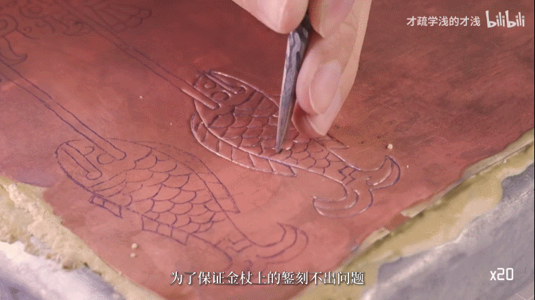 他用牛骨刀在金板上压划,画出纹路后再在反面加深,两条平行纹路就这样巧妙地被刻划了出来。