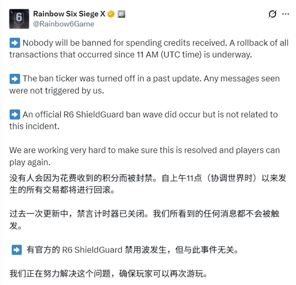 面对失控的局势,育碧已紧急关闭PC、PS5、Xbox等全平台服务器及游戏内市集,并将对将对UTC时间12月27日11:00以后的所有交易数据进行“回档”,并表示没人会因为动用异常获得的货币而遭到封禁。